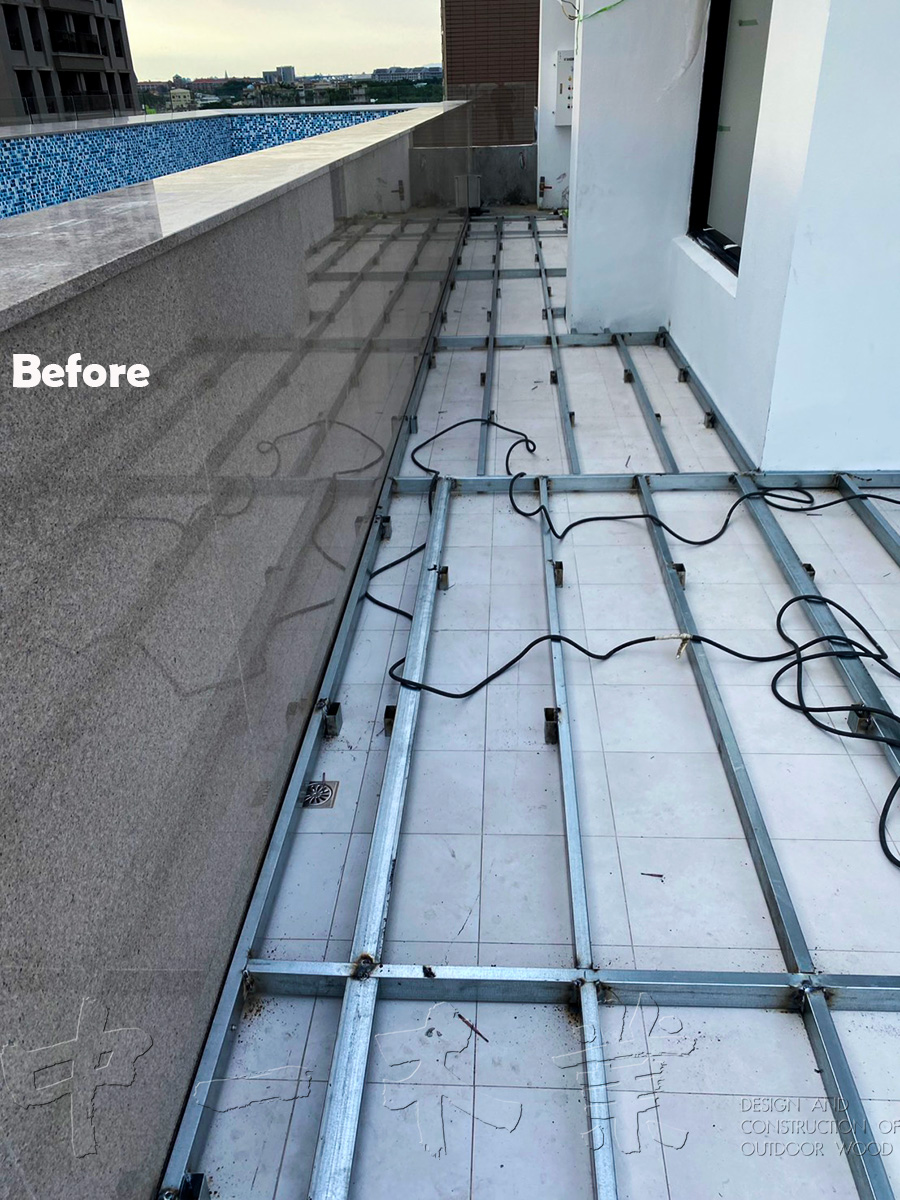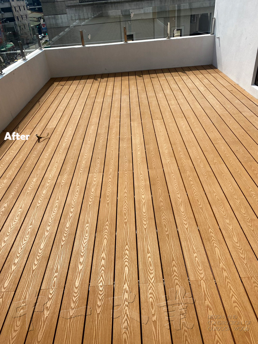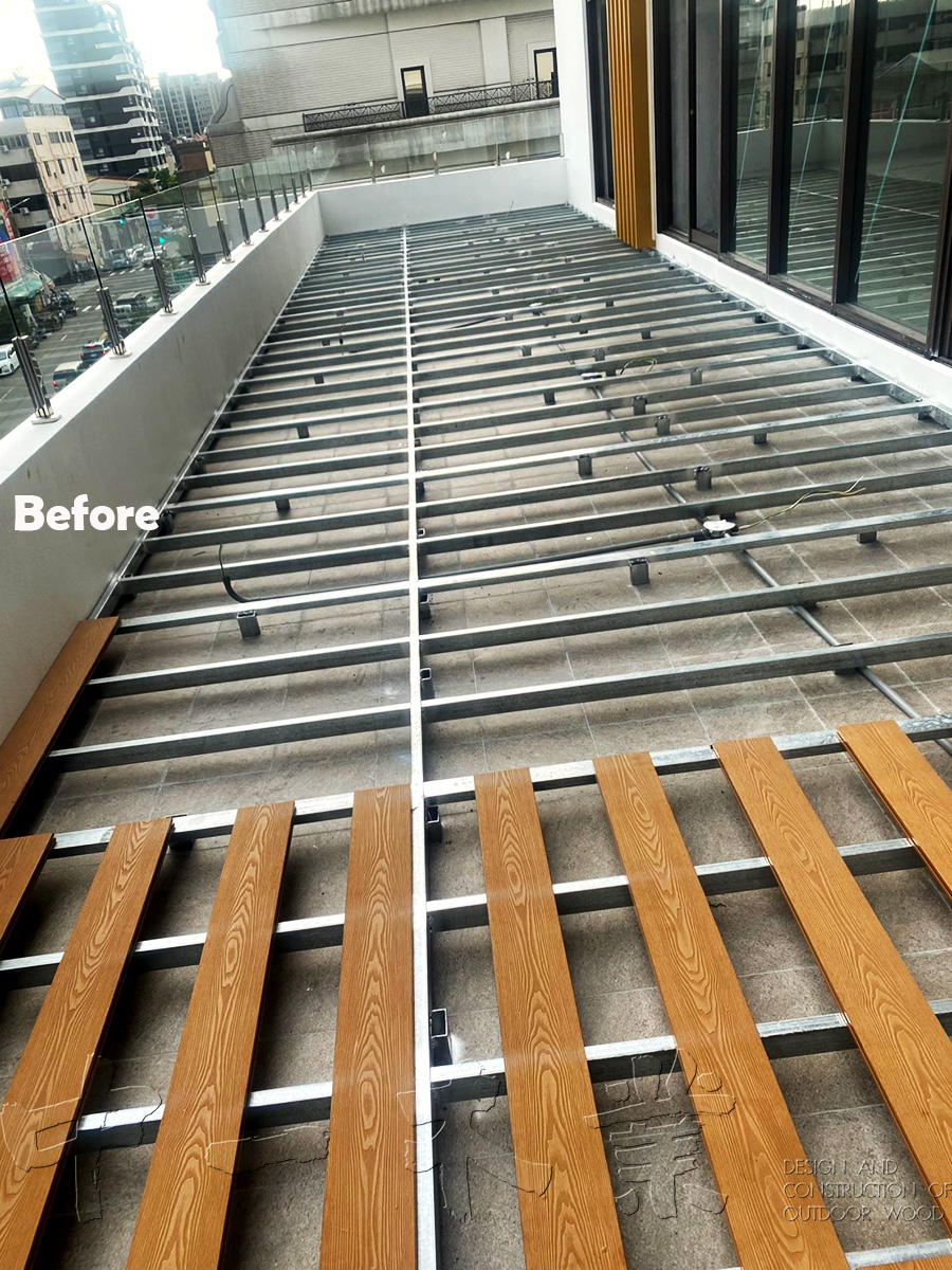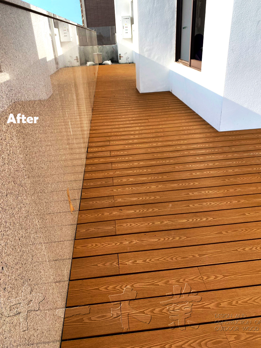 改造前僅能看到單調的地磚,顯得冰冷;改造後鋪上細緻紋理的「戶外木地板」,
