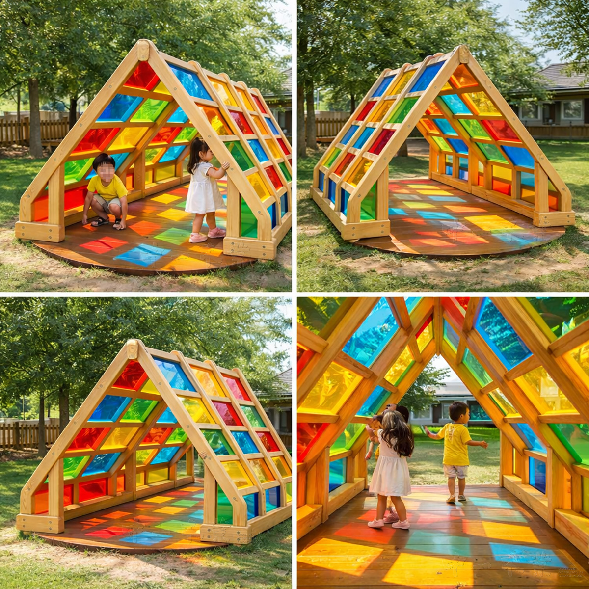 透光面板選用安全的彩色壓克力材質,讓自然光在不同時段投射出變化的色彩。孩子在行走、停留與觀察的過程中,自然接觸顏色辨識、光影變化與空間感知,這是一種不需要指令、也不造成吵雜的感官學習方式,特別適合幼兒園日常長時間使用。
