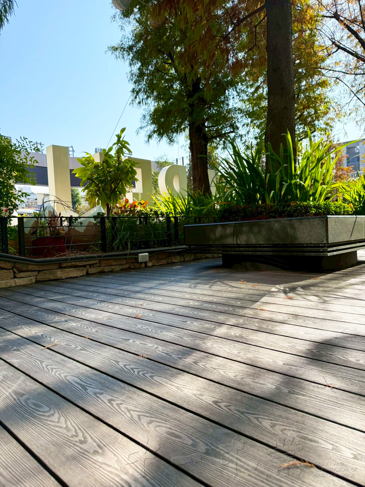 陽光灑落在木平台上,細緻的木紋與自然光影交織,如同剛出爐餅乾的溫潤質感,樸實卻令人感到親切。
