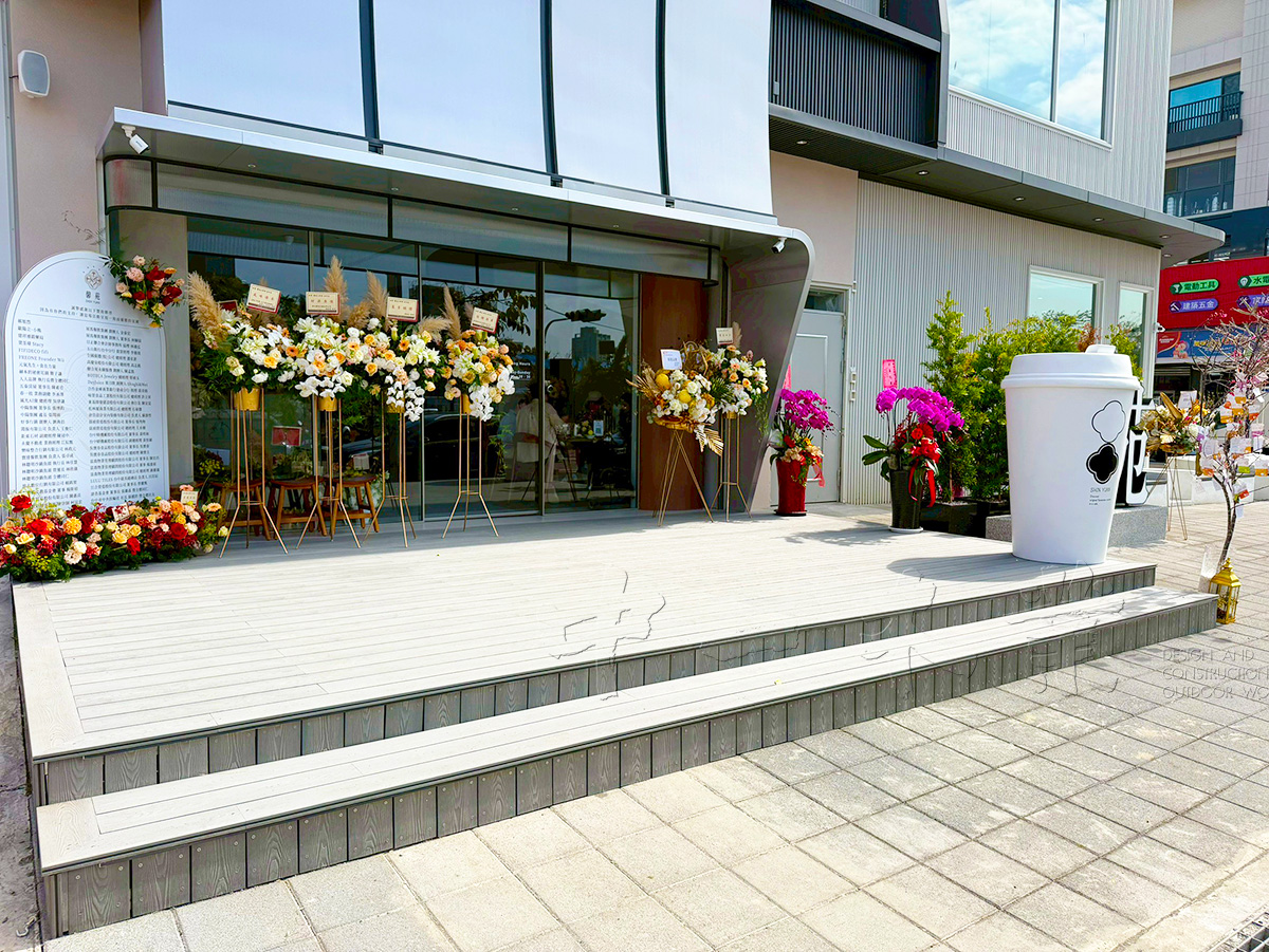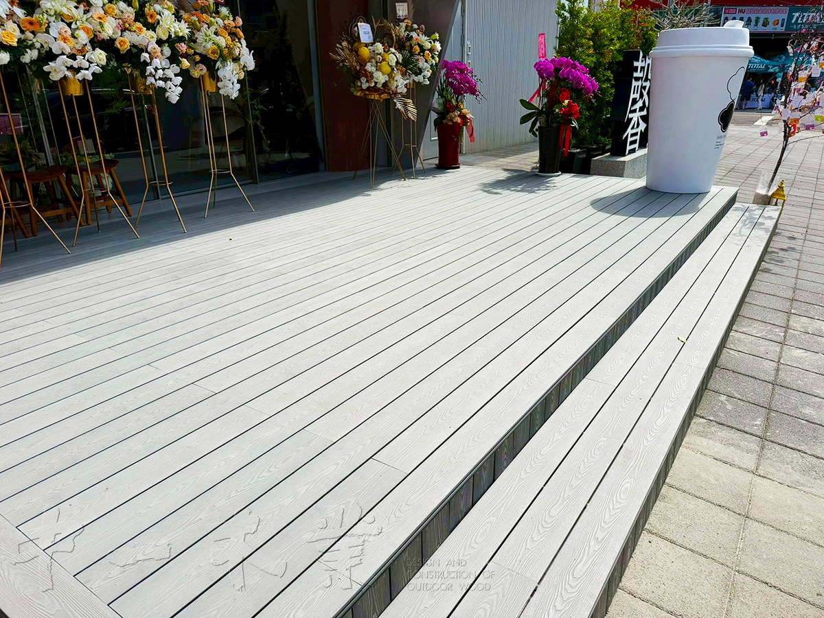 我們這次選用了具備高耐候性、不易腐壞且維護容易的優質塑木材料。淺灰色的木質紋理,不僅與現代建築的簡約線條完美融合,更在陽光下透出溫潤的質感。