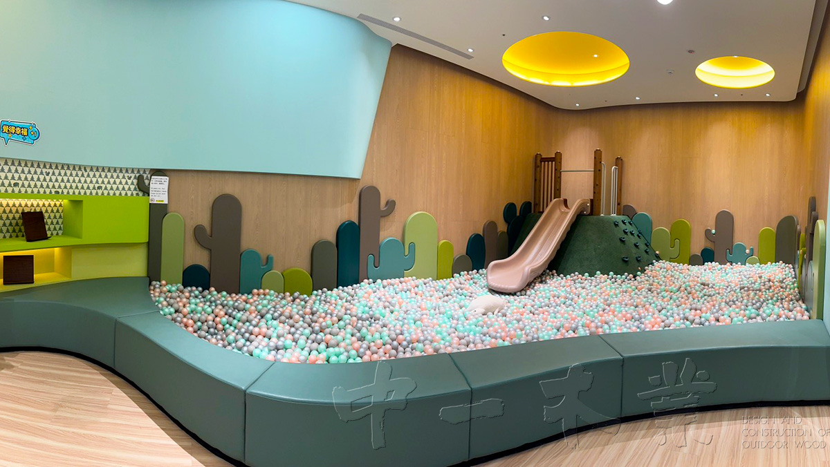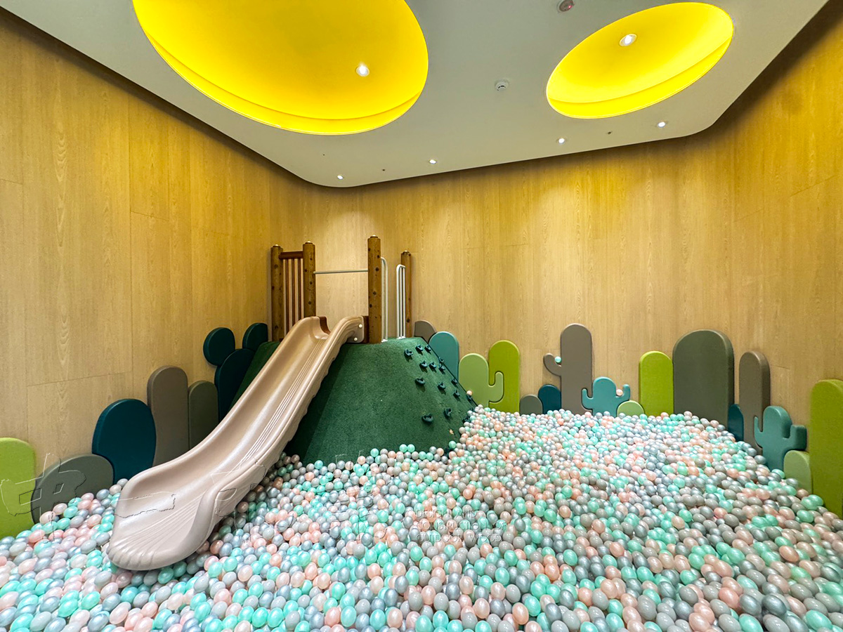 ●繽紛馬卡龍球池: 選用溫柔的粉嫩色系球池,搭配夢幻的室內燈光設計,營造出活潑且柔和的遊玩視覺。