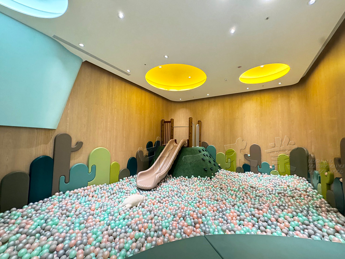 ●暖系木質環繞: 大面積的木紋牆面延伸了溫潤質感,讓室內遊樂空間與社區整體的居家溫度接軌。